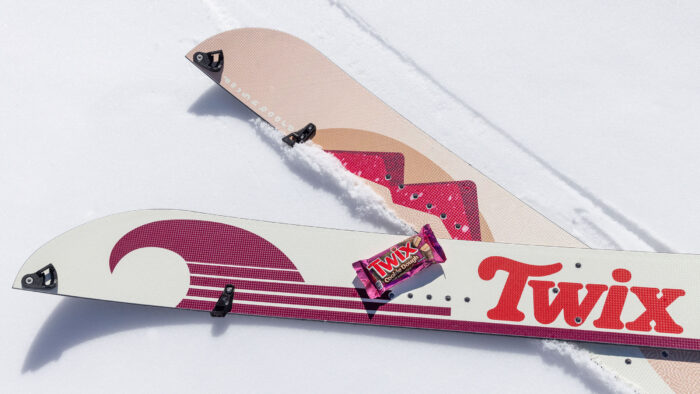 Here are two things that go great together: snacks and snowboarding. Don’t believe me? Check out the TWIX Doughboard. A TWIX snowboard might sound fun, but a TWIX splitboard actually makes sense. The concept of the dichotomous left and right TWIX is evident in this special-edition splitboard that brings the classic candy “twin” bars to life.