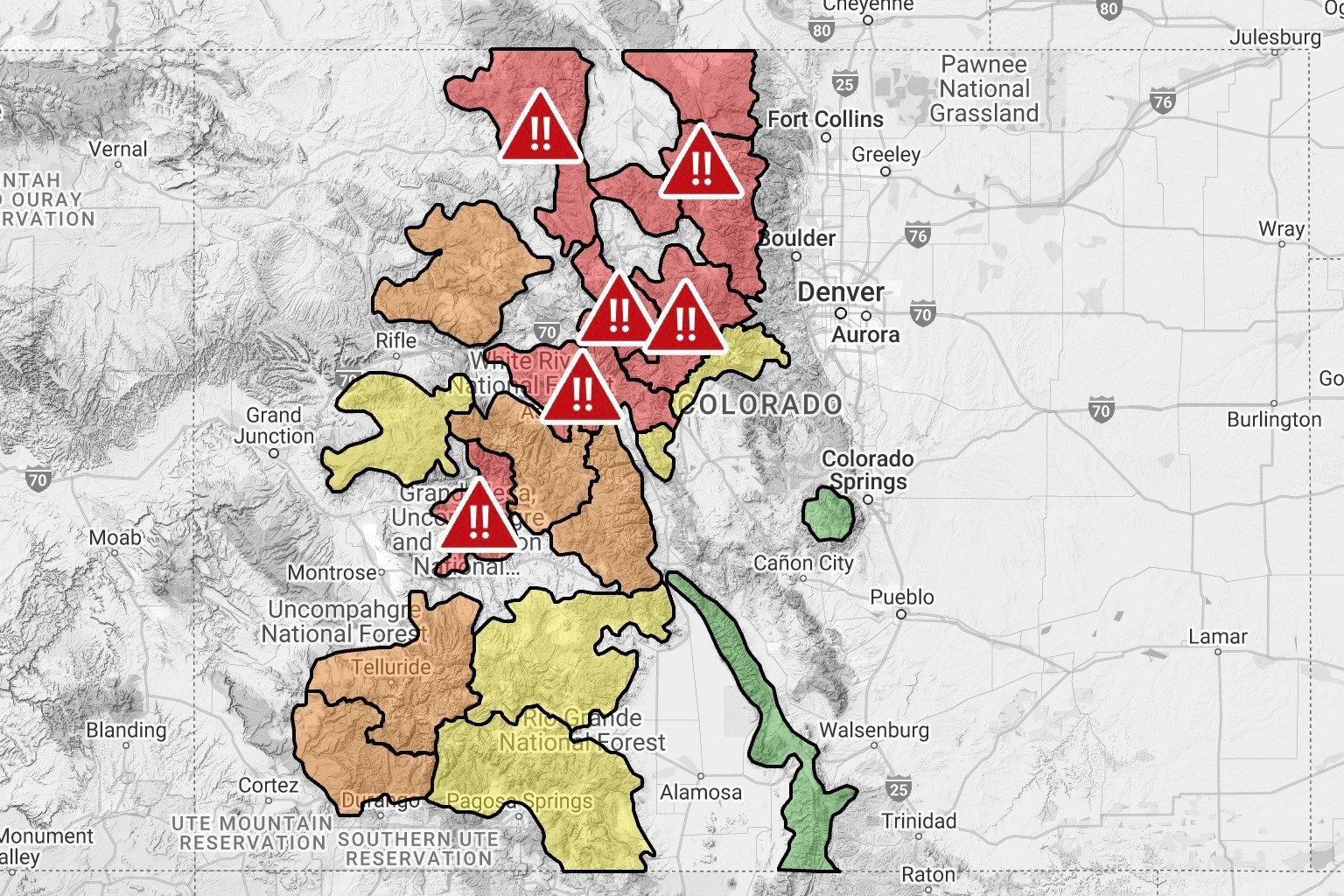 As a result, CAIC has issued avalanche warnings for the Park Range, Elkhead Mountains, 10 Mile Range, Front Range, Gore Range, Elk Range, Sawatch Range, West Elk Mountains, Ragged Wilderness, Ruby Range, and the mountains around Loveland and Berthoud Passes. All of those zones are currently rated as “High” avalanche risk based on the North American Avalanche Danger Scale.