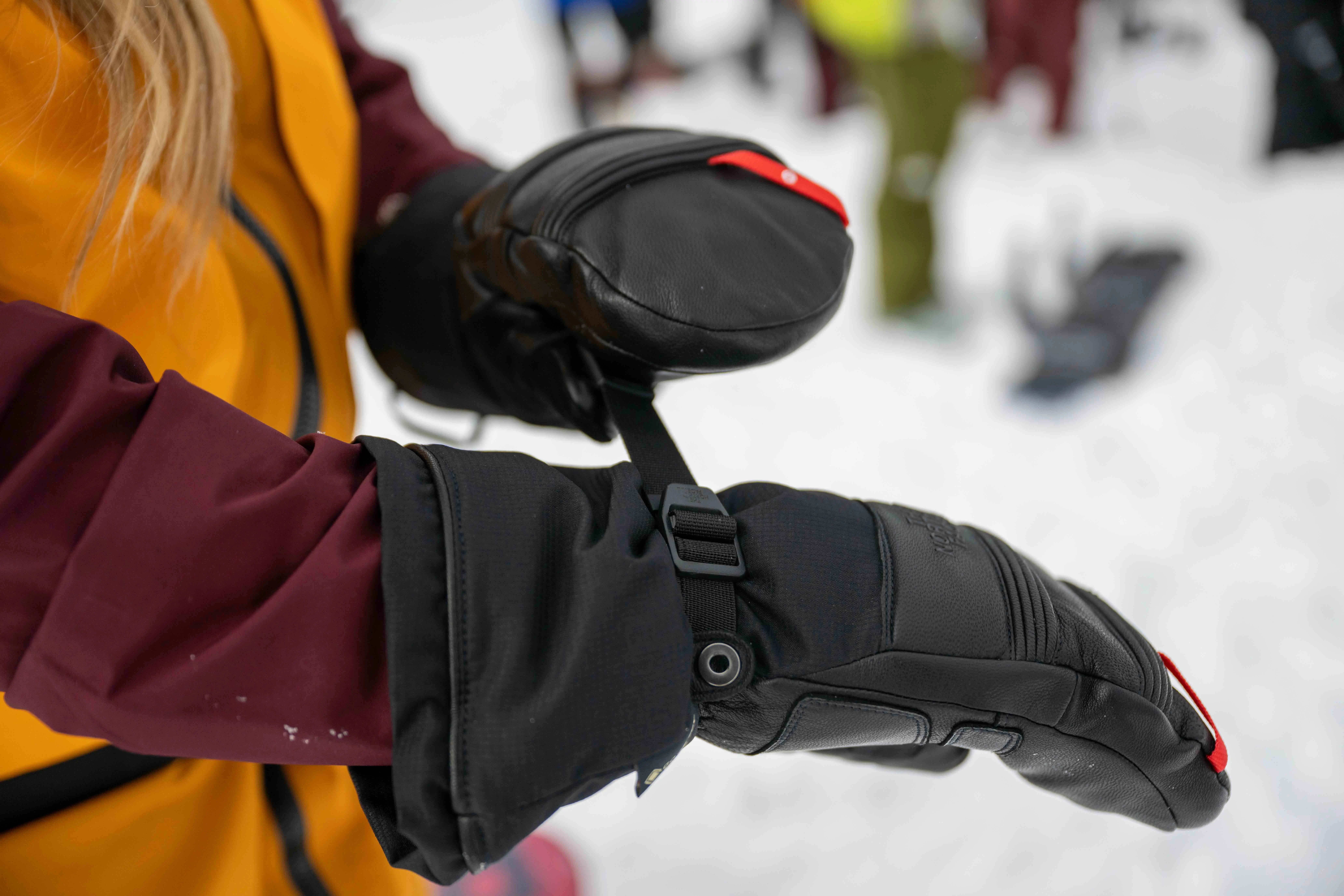 Another unique detail I haven’t seen on other mitts is the basic yet strong snap that secures the pair. I wasn’t sure if it’d hold, but it does. I could quickly toss the duo into my ski pack or mountaineering tent. There are also carabiner loops near the top of the index finger, where the mitt is ergonomically precurved.