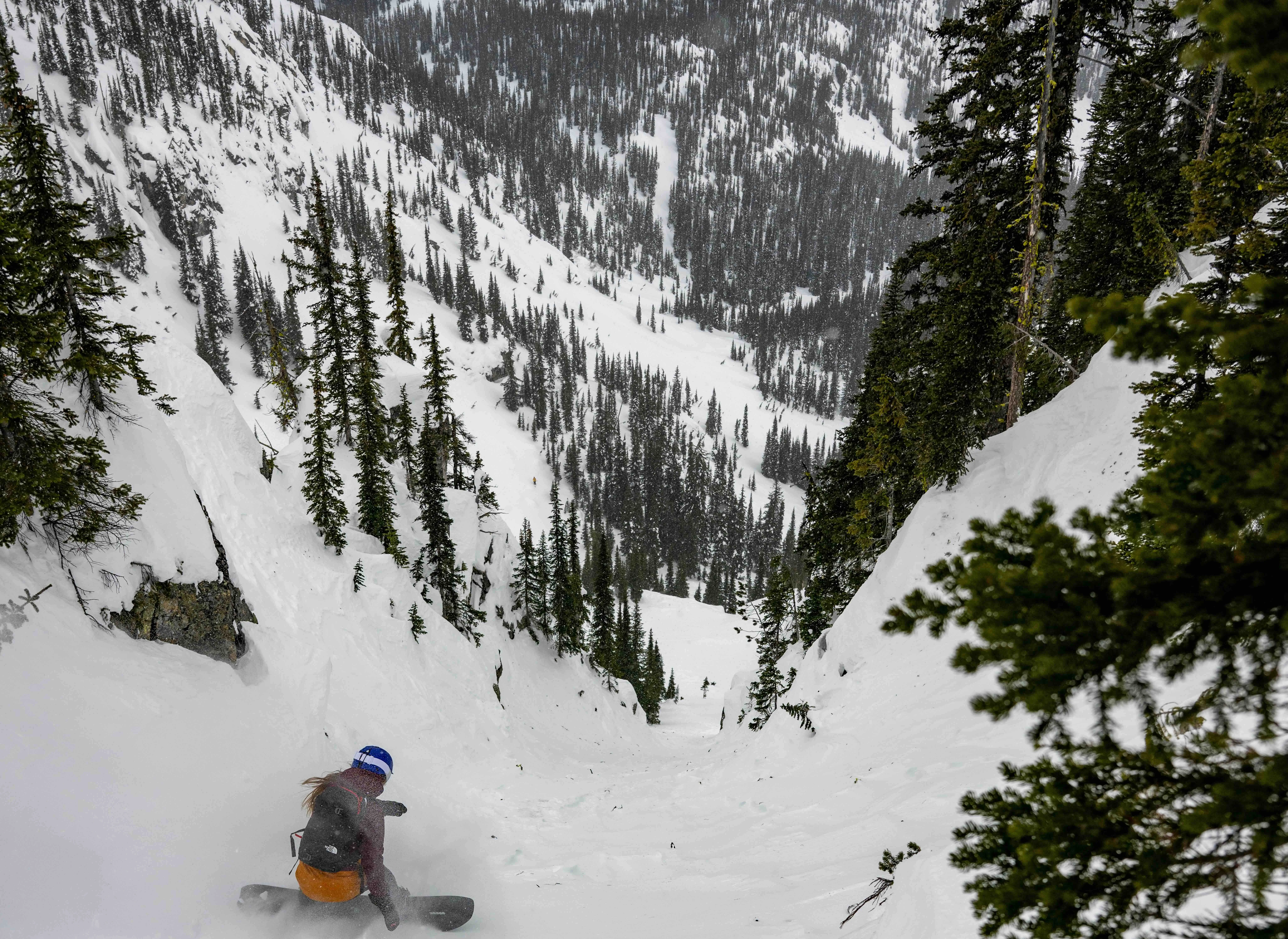Our group of backcountry skiers and snowboarders lined up edge to edge at the top of the narrow couloir. One of our guides descended the ridge to check out a lower, wider entrance. Half of the riders followed.